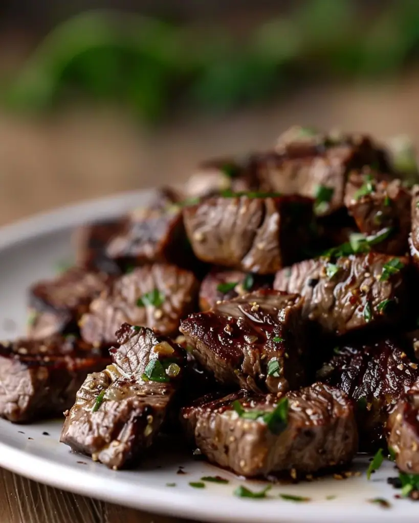 - Remove the skillet from heat, garnish the steak bites with fresh parsley, and serve immediately while hot.