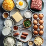 - Mix the egg layer: In a medium bowl, whisk together the 8 large eggs, 1 cup milk, ½ teaspoon garlic powder, ½ teaspoon onion powder, ½ teaspoon salt, and ¼ teaspoon black pepper until smooth.